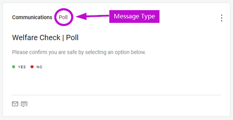 Each card details the message type, the pre-set message title, content and any required response options. Along with the pre-defined communication delivery channel, email and/or SMS. Learn more about Message Types at Get to know Communications.