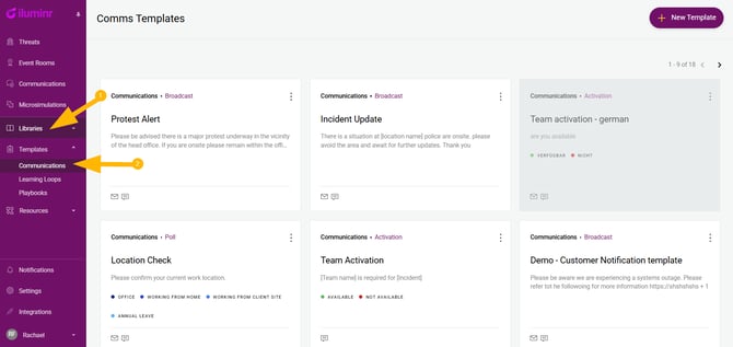 The Templates library will display currently available communication templates, displayed as individual cards.