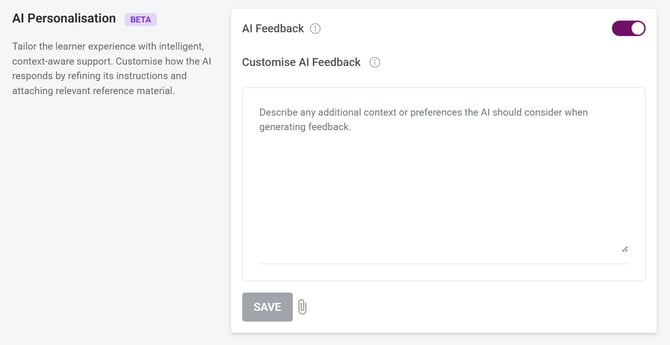 Tailor the learner experience with intelligent, context-aware support. Customise how the AI responds by refining its instructions and attaching relevant reference material. By default the AI Personalisaion is toggled OFF until an Admin User toggles this capability ON.