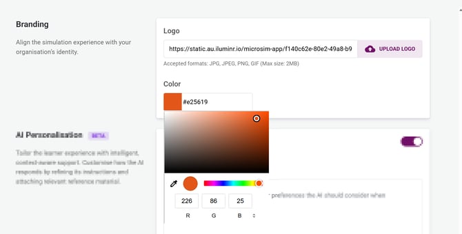 Align the simulation experience with your organisation’s identity by uploading your company logo (Accepted formats: JPG, JPEG, PNG, GIF (Max size: 2MB)) and selecting your company colour with HEX, RGB or the eye dropper.