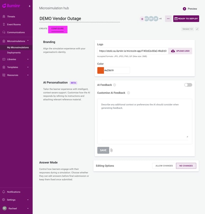 Use the AI Feedback toggle to enable or disable real-time AI-generated feedback for Learners based on their response during the simulation.