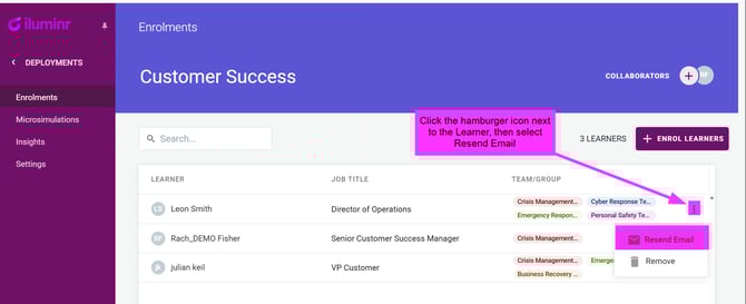 - Locate the Learner in the list, and click the three vertical dots (hamburger icon) next to their name.