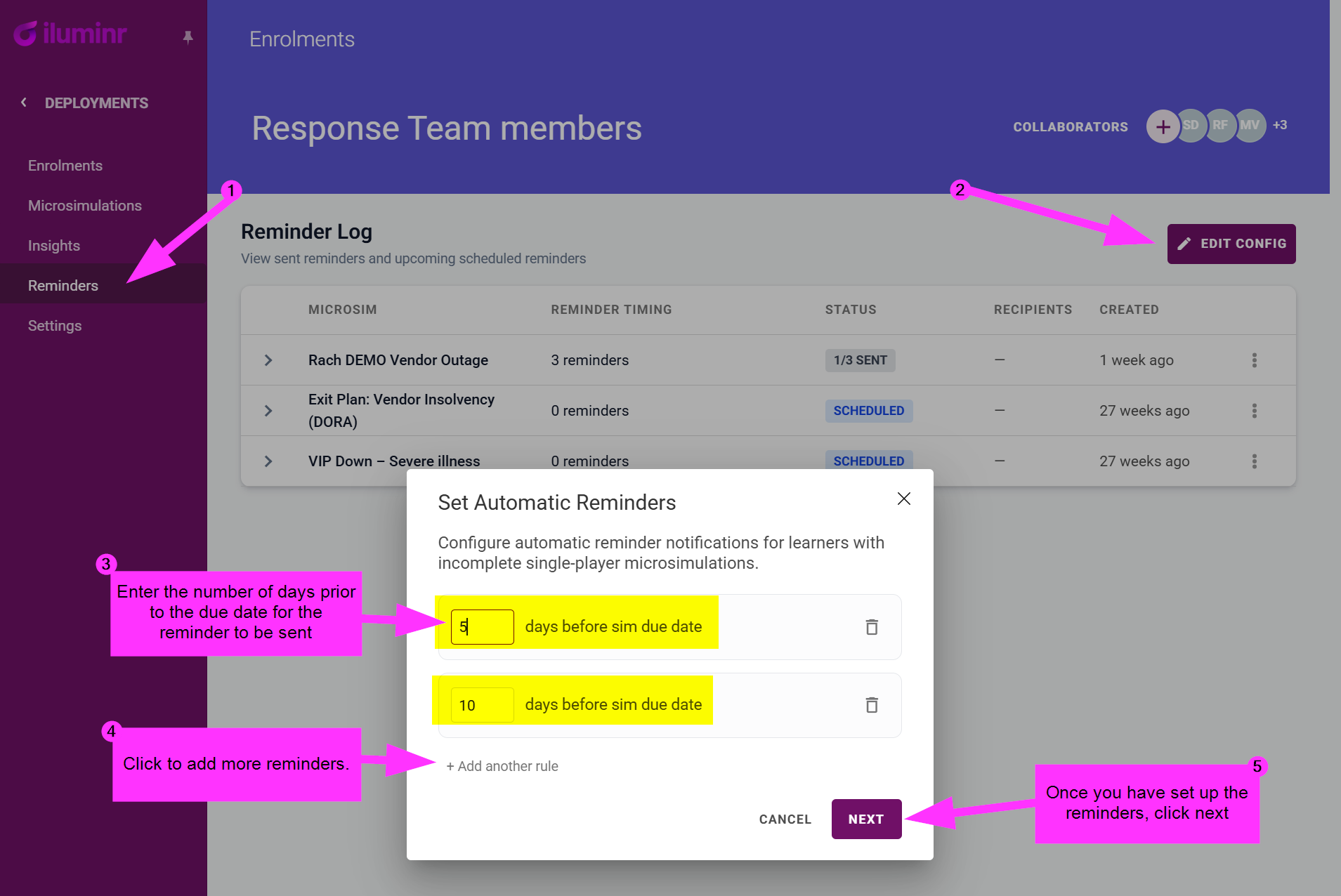 - Once satisfied with the reminders schedule, click Next